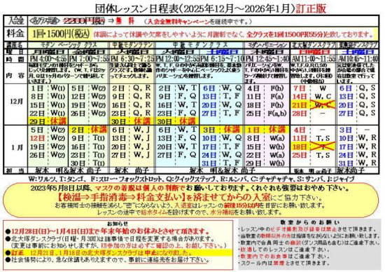 各1,500円。 - 団体レッスンに限り、予約はいりませんが休講や時間変更の場合がありますので、日程表や電話で確認してからお越しください。